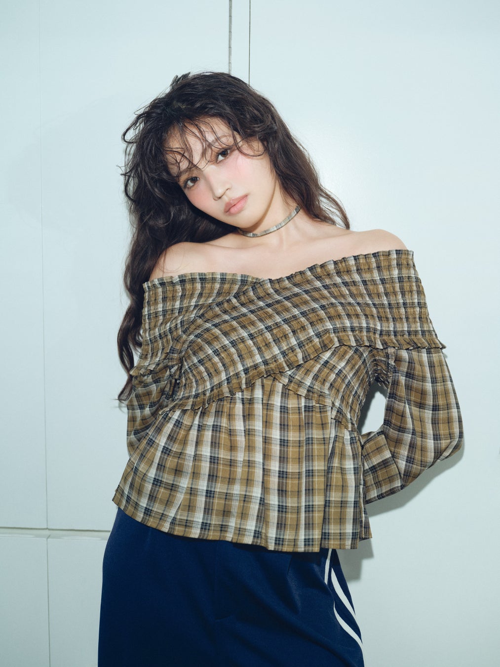 ②オフショルチェックブラウスのフェミニンさとエッジの効いたパンツで