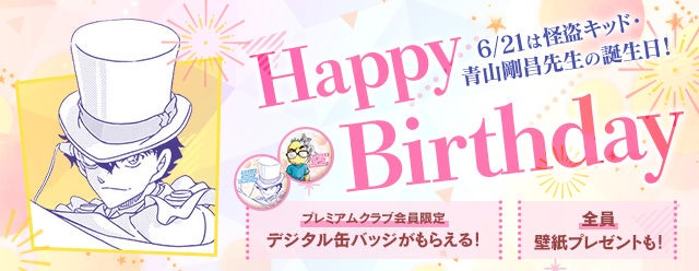 また、プレミアムクラブ会員の方は「怪盗キッド」と「青山剛昌先生」のバースデー記念デジタル缶バッジを獲得できます。