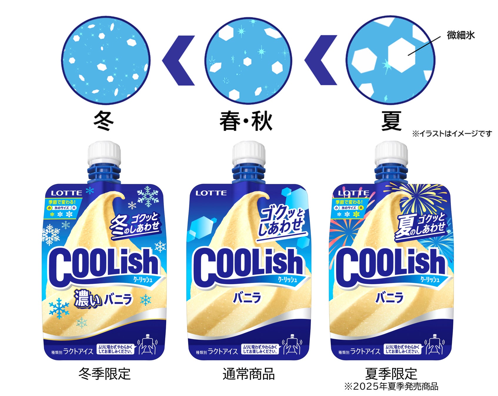 「クーリッシュ バニラ」「クーリッシュ ベルギーチョコレート」については、季節に合わせて微細氷のサイズを変えています。冬季限定品質は、春・秋よりも微細氷を小さくすることでマイルドな冷涼感と、よりなめらかな食感を楽しむことができます。また、夏季限定品質は、春・秋に使用している微細氷と比較しサイズが大きく、より強い冷涼感とシャリッとした食感が楽しめます。