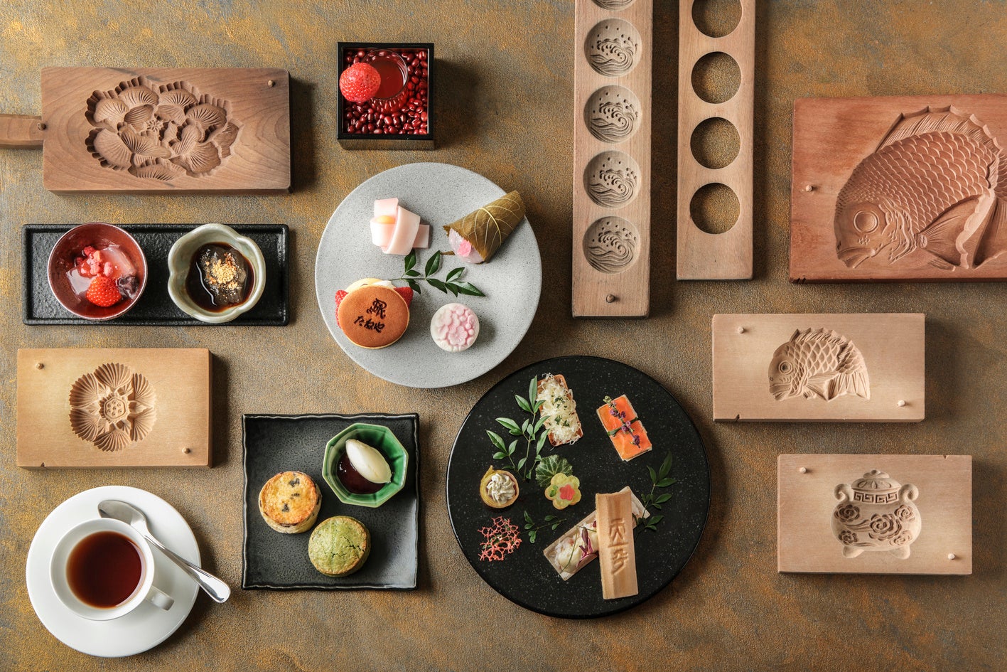 その哲学に呼応するように、セントレジスはもてなしの時間そのものを価値として育んできました。今回の舞台となるブラッスリー「RÉGINE」2階では、和菓子づくりの伝統である菓子木型をカウンターに配し、茶会を思わせる穏やかな設えを整えています。手仕事に宿る温度を感じながら、味わいと空間がひとつの物語として静かに結ばれていきます。