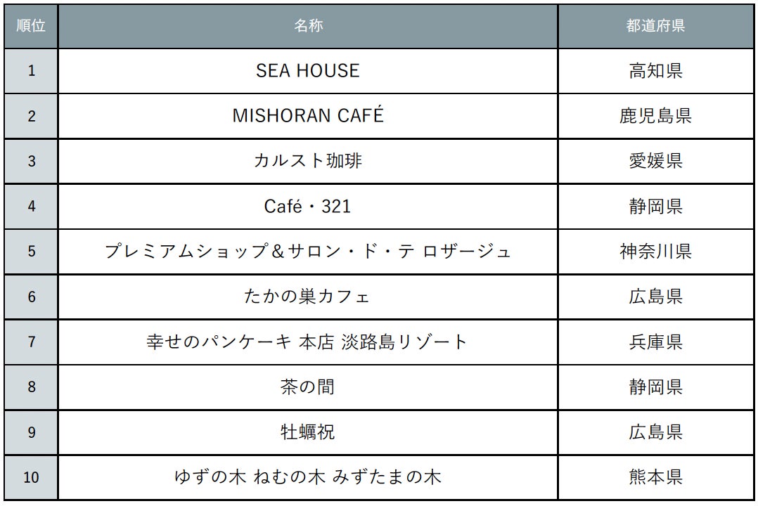 そのほかトップ10には、爽快感あふれるテラス席やおしゃれな店内から美しい景色を堪能できるカフェがランクインする結果となりました。雄大な山々、心地よい海の波音、爽やかな風を感じながら、おいしいランチやスイーツで身も心も癒やされる至福のひととき。ランキング結果を参考に、お気に入りのカフェに出かけてみませんか?