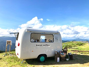 雄大な景色が広がるオープンエアカフェ。かわいいキッチンカーで例年4月から期間限定で営業しています。カフェオレは四国カルスト育ちの乳牛から搾った新鮮な生乳を使用していて、砂糖なしでも甘くておいしくいただけます。お店を利用した人限定で楽しめる絶景ブランコも解放感抜群!