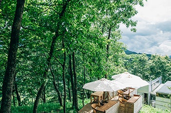 阿蘇五岳を見渡せる絶景が広がる全席屋外の天空カフェ。木立にたたずむウッドデッキで、鳥の声をBGMにゆったり優雅な時間を過ごすことができます。裏山にテラス席が増設され、どの席からも絶景を眺められるようになりました。完全予約制なので来店の際は予約をお忘れなく。