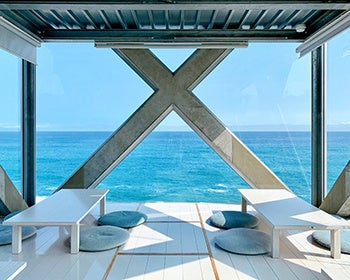 淡路島の西海岸に位置するパンケーキ店は全席オーシャンビュー。海が間近に迫る開放的なテラス席があります。敷地内には海の景色を活かしたフォトスポットがたくさんあり 、高さ約3mの透明な「幸せの椅子」に座って撮影すると、まるで海の上にいるような絶景写真になります。