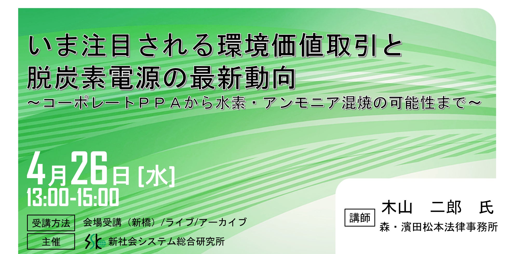 「いま注目される環境価値取引と脱炭素電源の最新動向」と題して、森・濱田松本法律事務所 木山 二郎氏によるセミナーを2023年4月26日(水)に開催!!