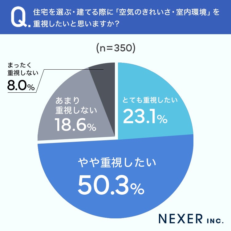 「とても重視したい」は23.1%、「やや重視したい」は50.3%で、合わせて73.4%が空気のきれいさや室内環境を重視したいと回答しました。「あまり重視しない」は18.6%、「まったく重視しない」は8.0%でした。