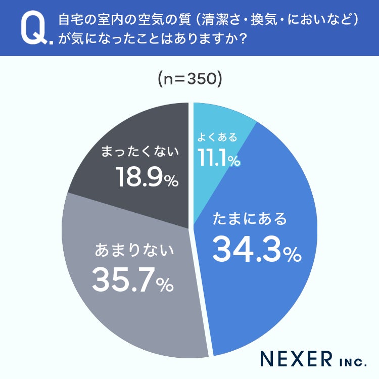 その結果「よくある」が11.1%、「たまにある」が34.3%で、合わせて45.4%の人が室内の空気の質を気にした経験があると回答しました。