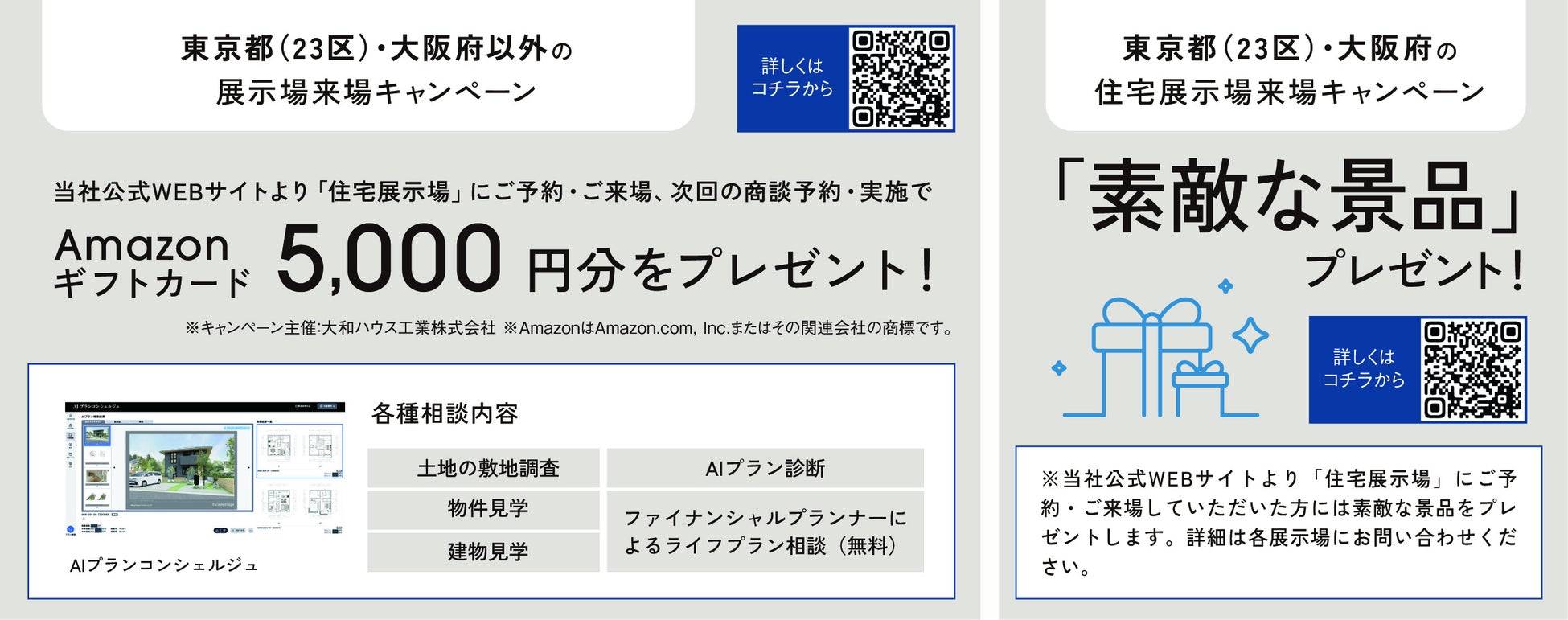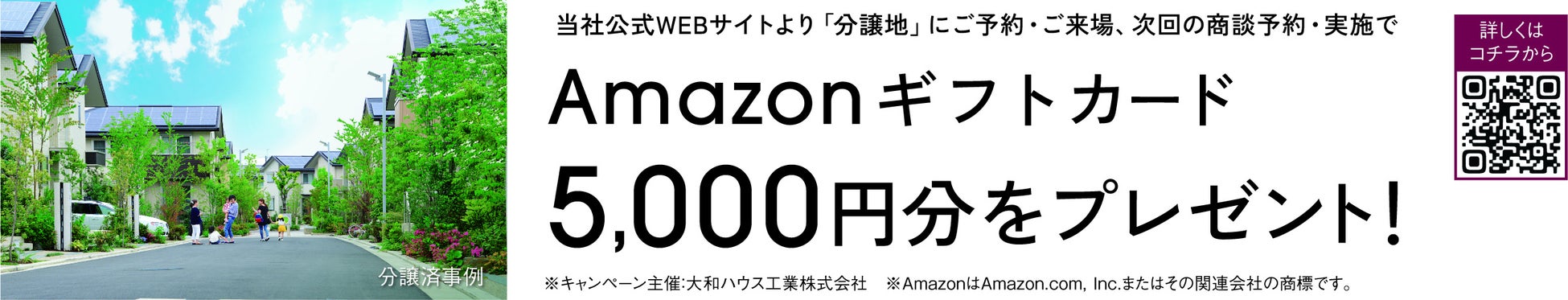 2026年1月5日~3月31日の期間中、大和ハウスの公式WEBサイトから「分譲地」にご予約の上、ご来場いただき、次回のご商談予約・実施いただいた方には「Amazonギフトカード5,000円分」をプレゼント。