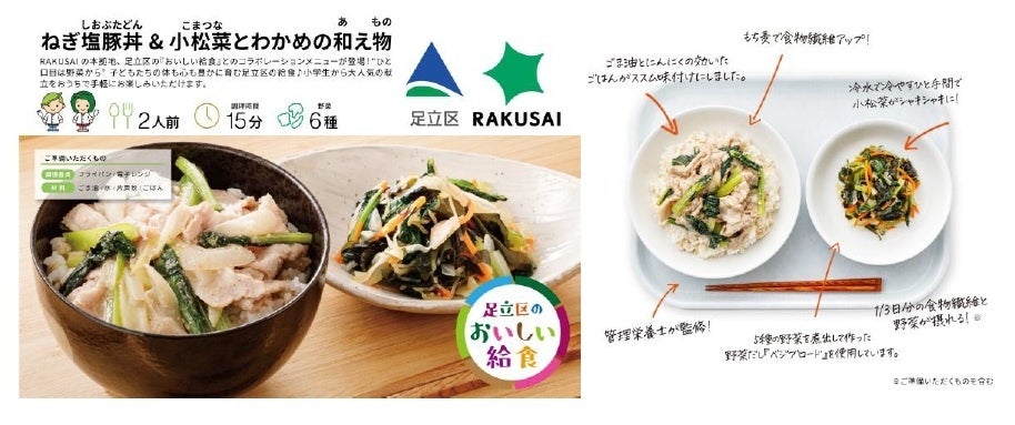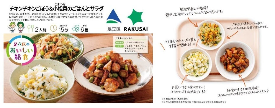 区のおいしい給食をご家庭で楽しめるミールキットを、足立区に本社を構える青果物の専門商社、デリカフーズグループの「楽彩株式会社」が開発。実際に区立小学校で給食を食べ、おいしさとこだわりに感動した楽彩スタッフが、味や食感を再現するため、試行錯誤を重ね完成した2品を販売します。