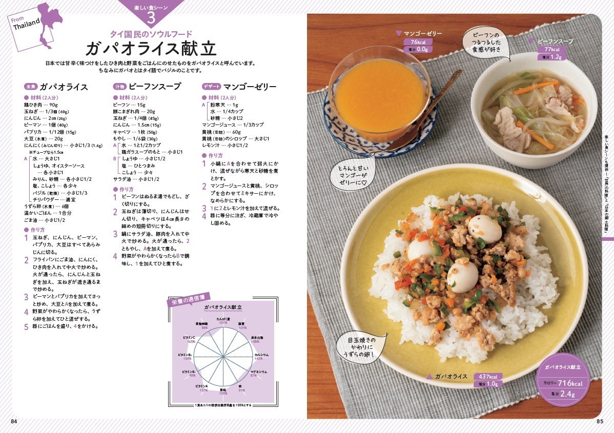 全メニューには、エネルギー量と塩分量を掲載。さらに、献立ごとには栄養バランスが一目でわかる12角形のグラフもつけていますので、小さなお子さんから健康面が気になるシニア世代まで役に立つ1冊になっています。