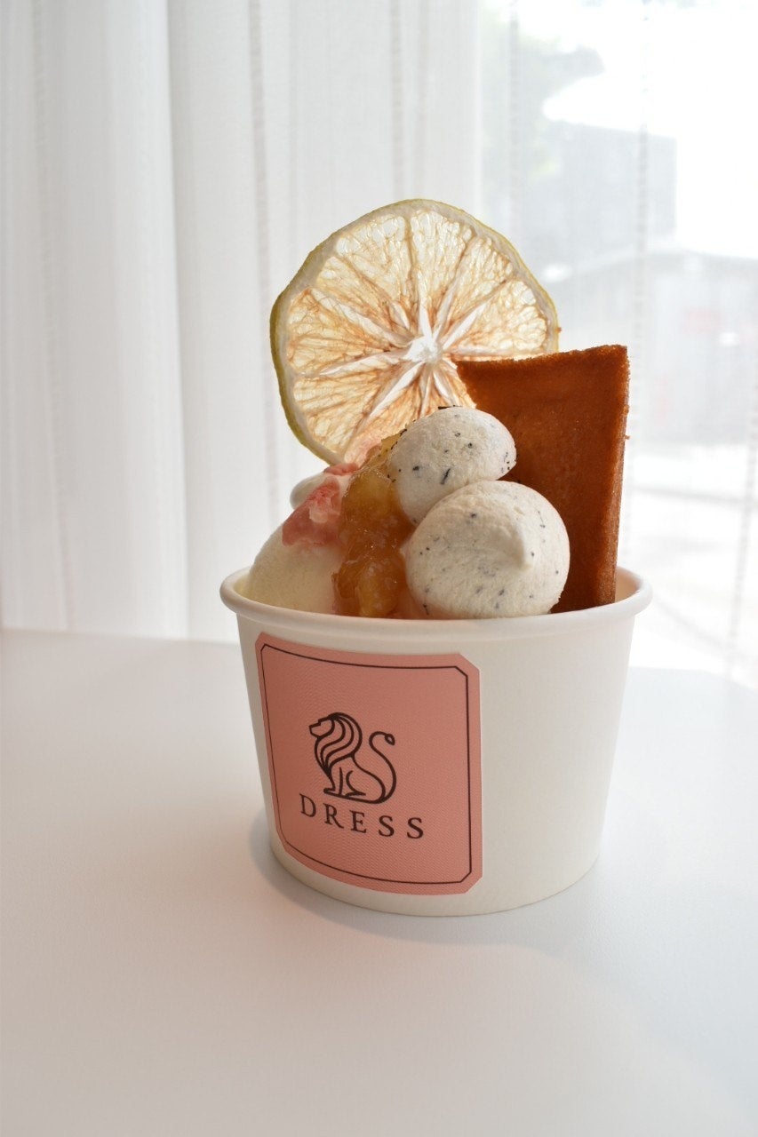 新潟県新潟市にあるパティスリー<DRESS MITA MASAKI LAB.>。ヨーグルトソルベに自家製のアールグレイ風味レモンコンフィチュールを添え、焼きたてのはちみつレモンフィナンシェを飾りました。様々な食感を入れており、チョコレートのクルスティアンや紅茶のメレンゲ、ゆるくたてた生クリームなど、食べていくうちに変化する食感もお楽しみいただけます。直前でシェフの父が採るアカシア蜜をかけて提供することもポイントです。低糖のヨーグルトソルベがより食べやすくなります。
