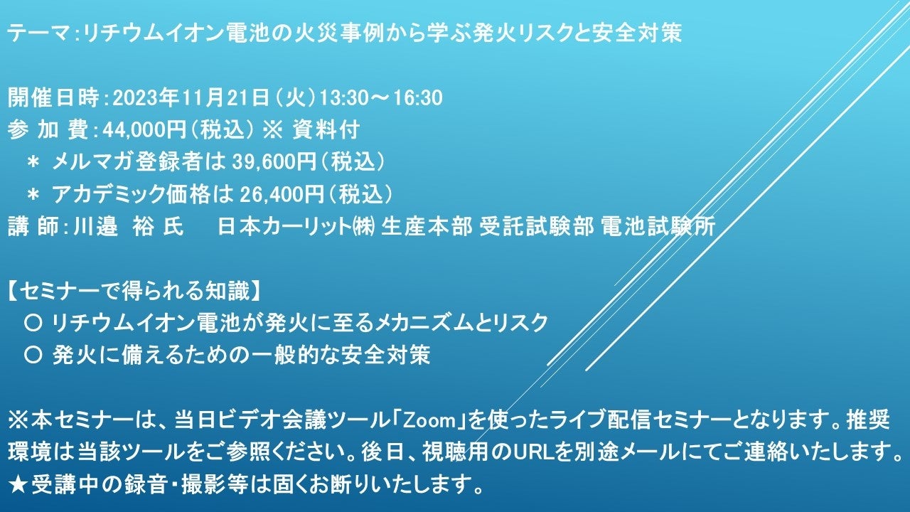【ライブ配信セミナー】リチウムイオン電池の火災事例から学ぶ発火リスクと安全対策 11月21日(火)開催 主催:(株)シーエムシー・リサーチ