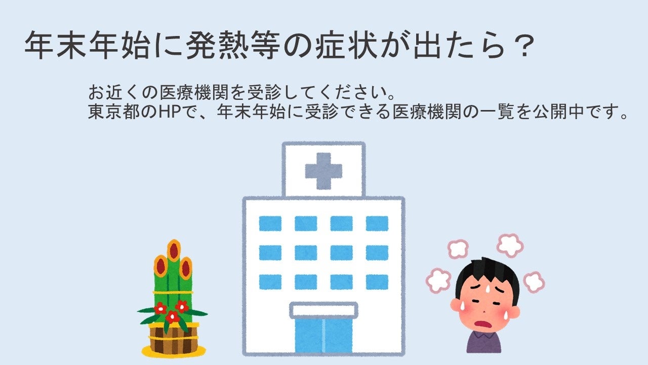 東京都のHPで、年末年始に受信できる医療機関の一覧を掲載しています。