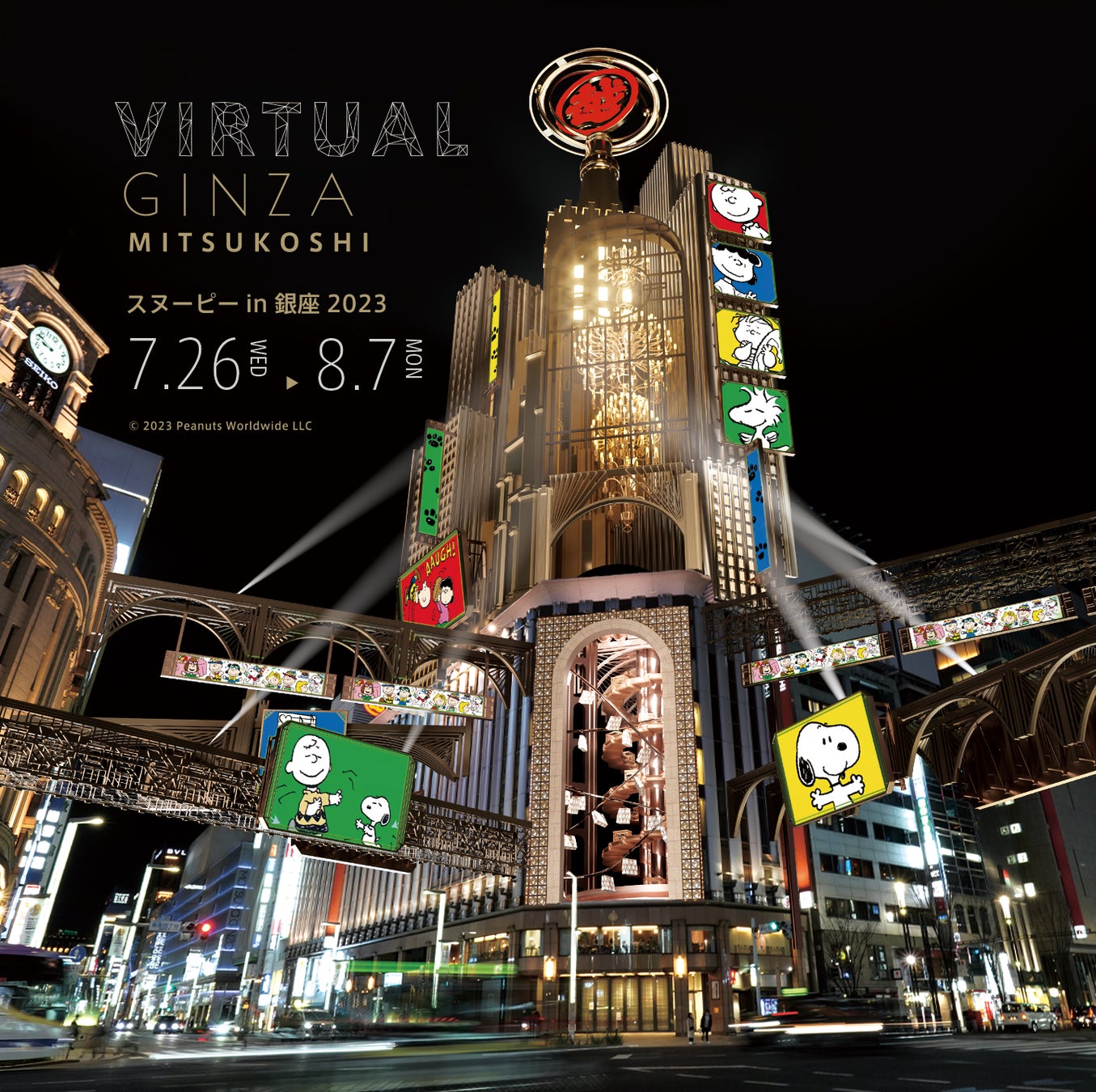 銀座三越は、「スヌーピー in 銀座 2023」を開催している7月26日(水)~8月7日(月)の期間、ソニーグループで最先端のデジタルソリューションを提供するSoVeC株式会社との協業で、銀座4丁目交差点に面する銀座三越の外壁「銀座シャンデリア」を中心に複数の大型ビジョンや飛び交うドローンが近未来の世界観を表現した「Virtual GINZA mitsukoshi スヌーピー in 銀座 2023 Ver.」を次世代アプリ「XR CHANNEL」にてご提供いたします。