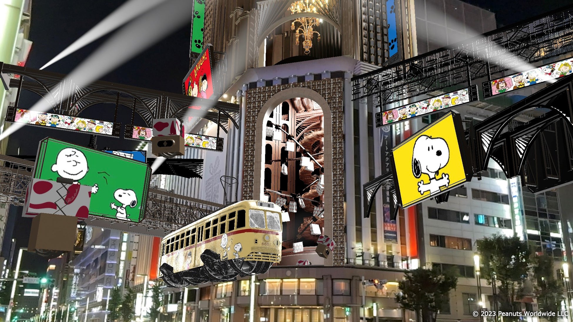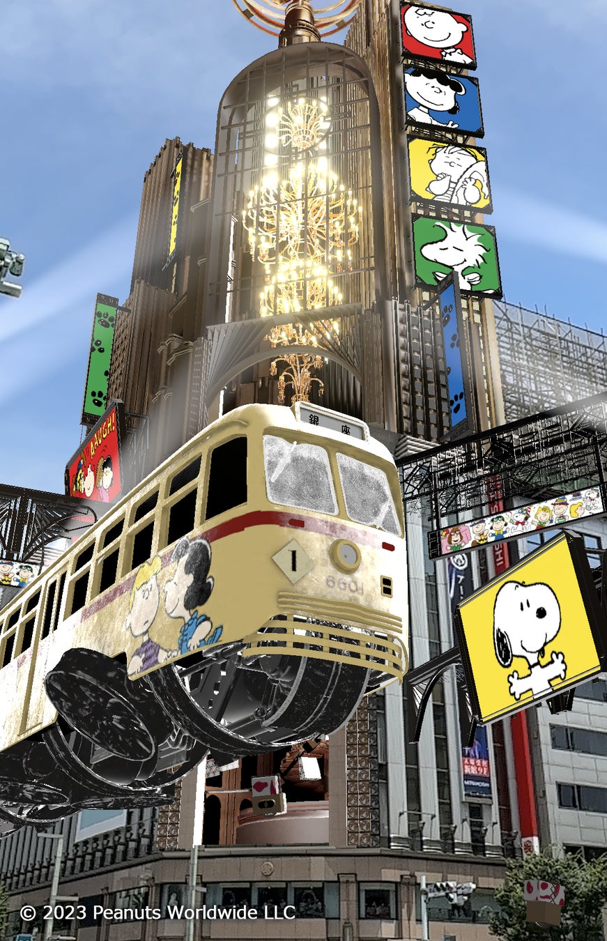 「Virtual GINZA mitsukoshi」ではスヌーピーと仲間たちがお店を飛び出して銀座4丁目交差点でもパーティーをしているかのようにバーチャルギンザをジャックします。1967年まで銀座の街を走っていた路面電車を彷彿とさせるトレインもスヌーピーと仲間たちでかわいくラッピングしています。