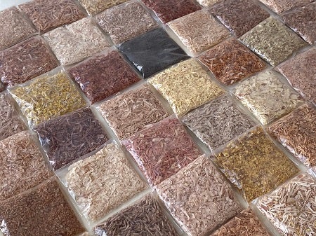 国土の約3分の2が森林の日本は、南北に長く、多種多様な樹々が生息しています。森で伐採した木は「土場」と呼ばれる集積所へ運ばれます。「森のクレヨン」は、通常ははじかれるゆがみや割れのある木を中心に、製材の際に出た切れ端、おがくずなどを原料に選んでいます。木の色は、樹種によってさまざまです。それぞれ工場で細かく粉砕してパウダー状にし、米ぬか由来のライスワックス、米油と混ぜ、型に流し込んで冷まします。