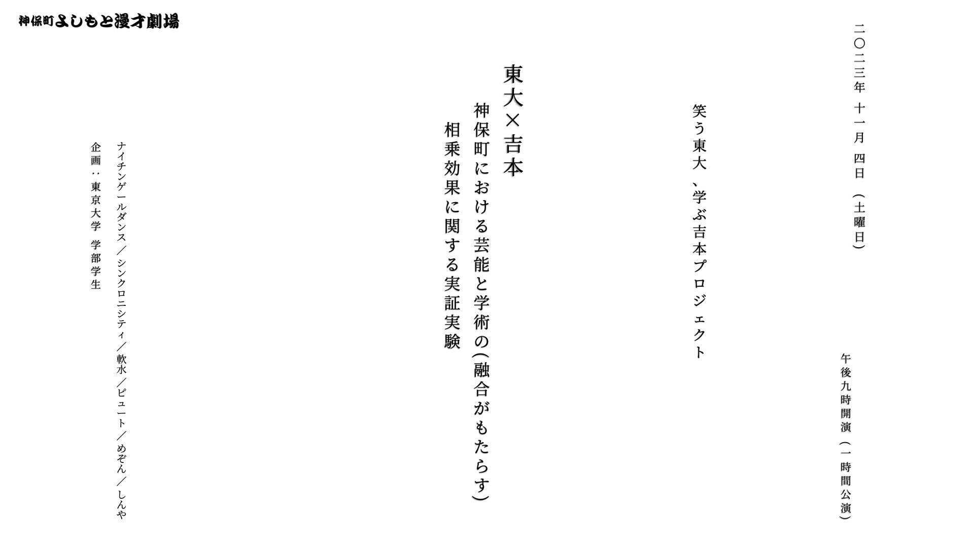 公演名:東大×吉本 神保町における芸能と学術の(融合がもたらす)相乗効果に関する実証実験