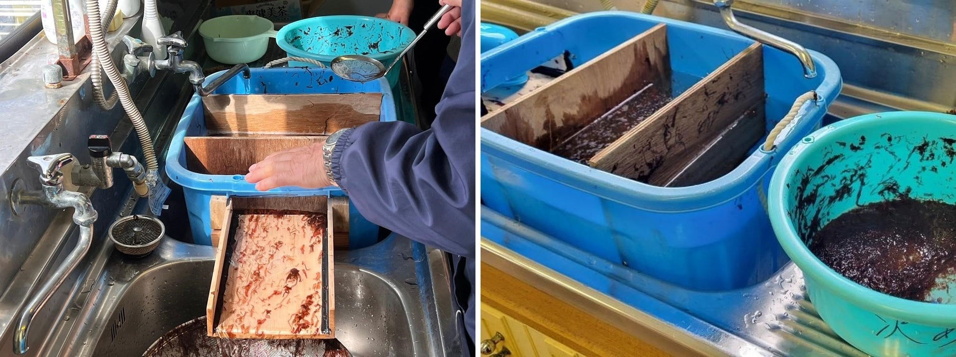 さらに不純物を取り除くため、専用の箱に水と岩のりを流します。