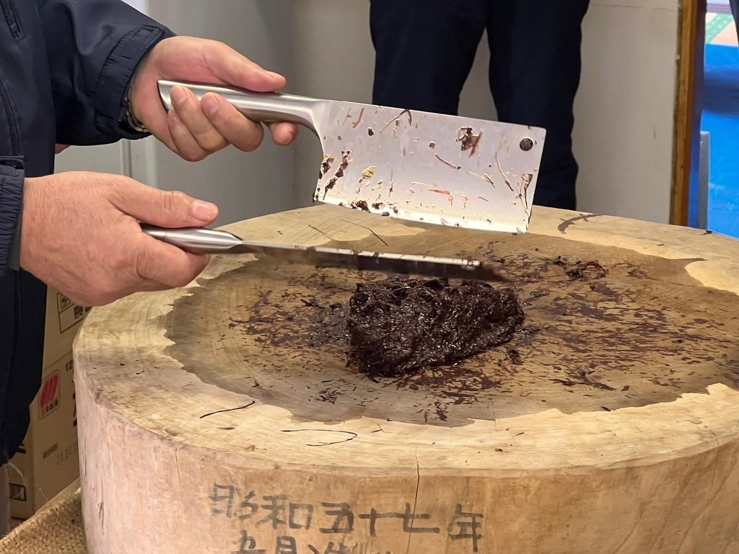 包丁で強くたたいても壊れないように、「のりたたき台」と呼ばれるまな板には丈夫なケヤキの木を使用しています。また、その日使う岩のりの状態によって刻む細かさを変えているそうです。