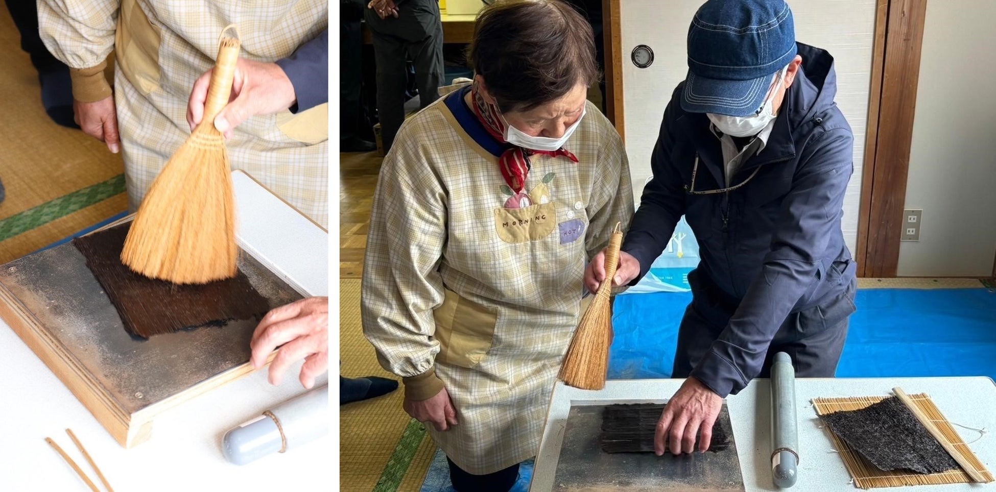 最後に小さなほうきを使い、のりの表面についている小さなごみや砂を落としたら、板のりが完成!