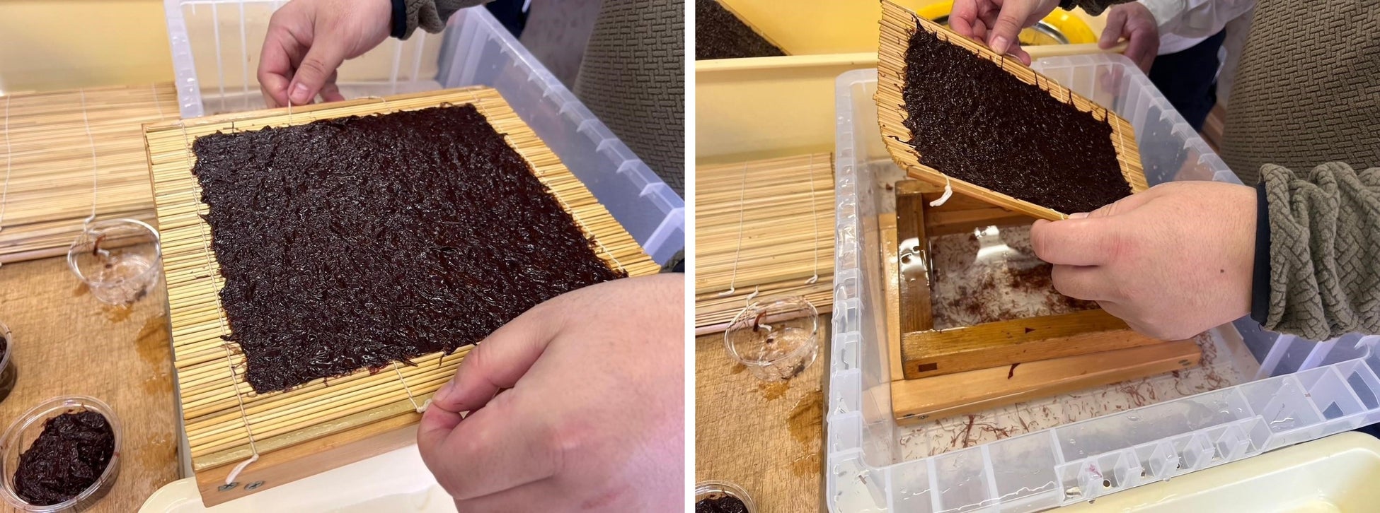 「のりず」に乗せた岩のりを均等な厚さになるように手でならします。