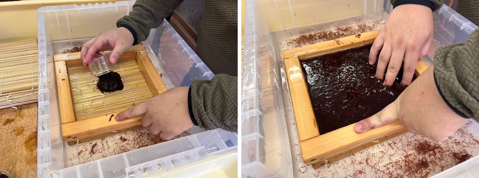 岩のりが均等に広がったら、水から引き上げて「のり枠」をそっと外します。
