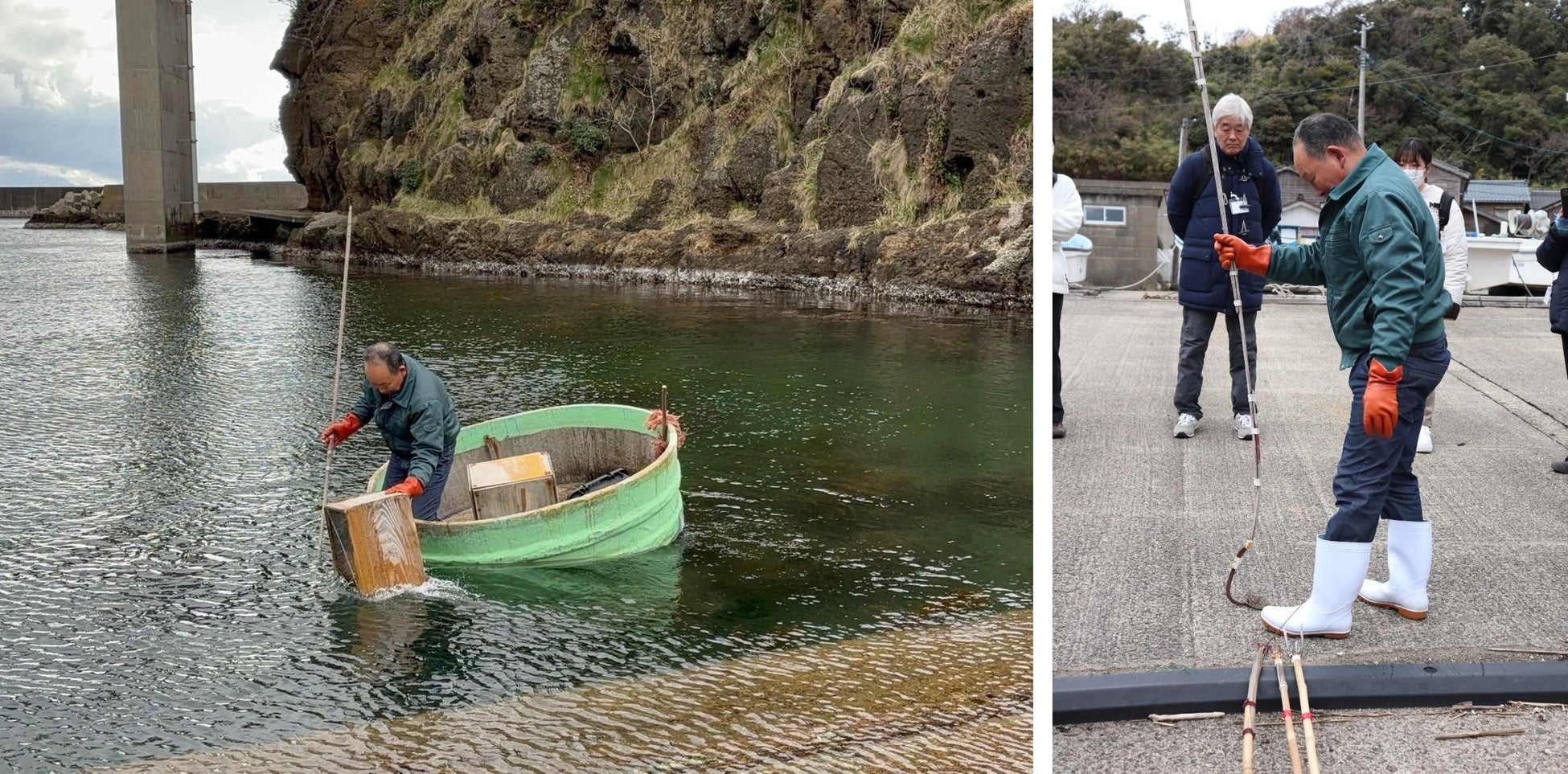 今回は、実際にたらい舟での漁の様子を見学させていただきました。