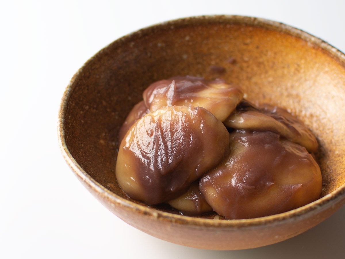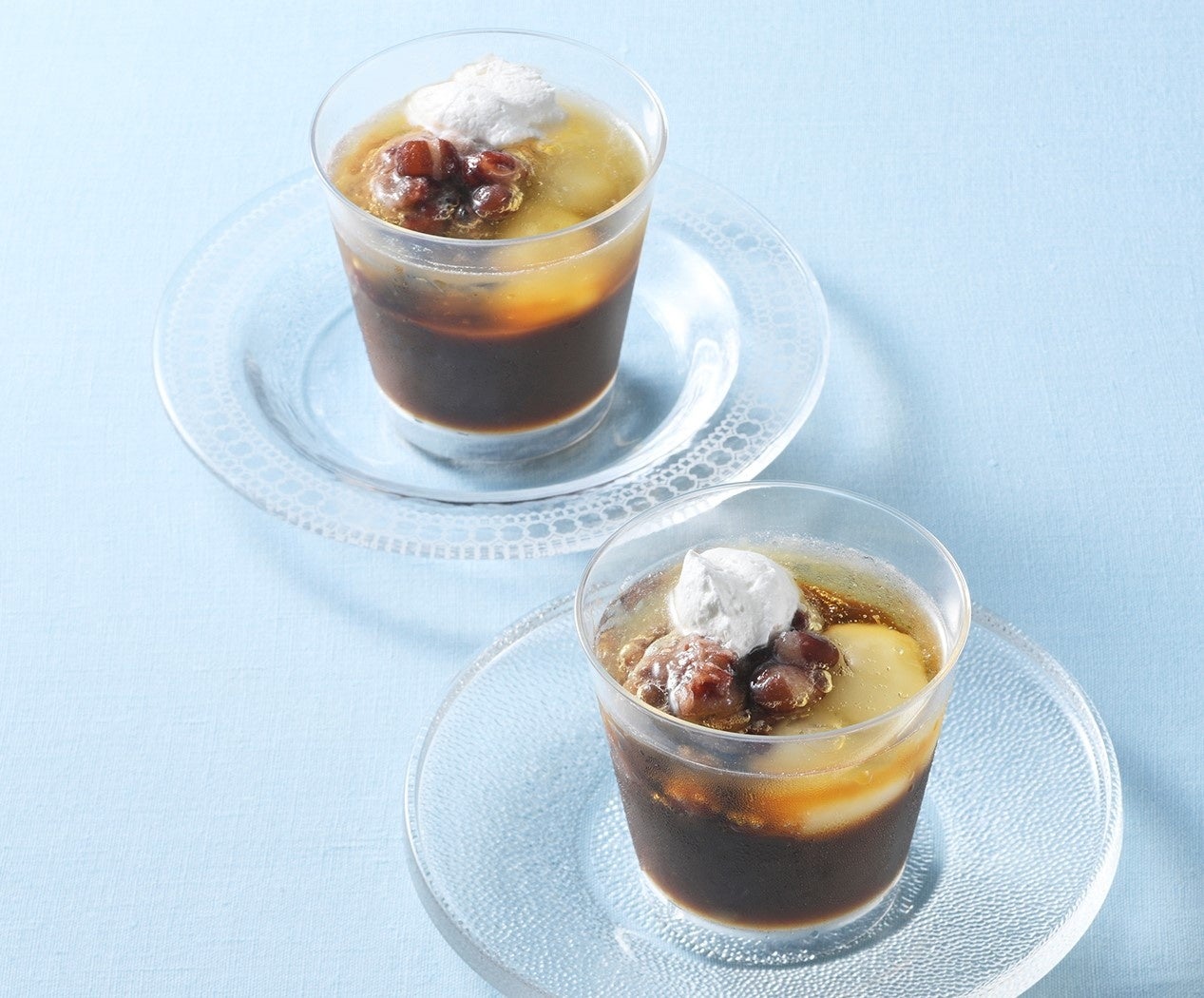 自家製粒餡と白玉団子を、エチオピアコーヒーの香り高い珈琲ジュレに合わせました。コーヒーのほろ苦さと餡の甘さが絶妙な一品です。