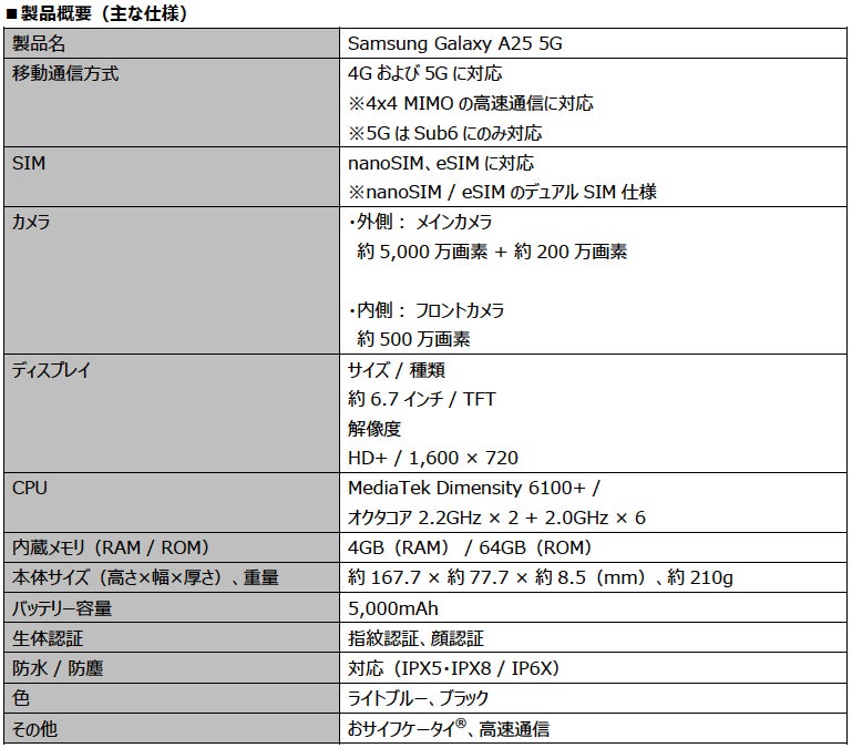 楽天モバイル株式会社(以下「楽天モバイル」)は、「Samsung Galaxy A25 5G」を、本日11月20日(木)午前9時より「楽天モバイル」公式サイトにて、また11月27日(木)より「楽天モバイルショップ」にて、製品価格22,001円(税込)で発売します(注1)。本製品は、大画面で快適な操作性、大容量バッテリー、あんしん機能を備えた5G対応スマートフォンです(注2)。
