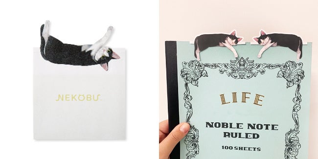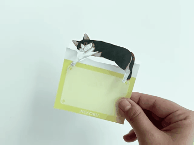 あらかじめついているラインに沿って、猫を手前にくるっと回転するように山折りすると、だら~んとくつろぐ猫が登場。メッセージ欄をノートや本に挟むと、その上で猫がくつろいでいるような様子を楽しめます。