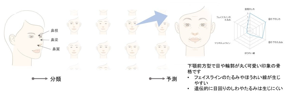 この画像解析技術と、鼻の骨格と肌状態や肌内部との関係性に関する知見を組み合わせ、顔を16種類のタイプに分類し、それぞれについて将来的に表れやすい肌悩みと肌内部の状態を予測することができるツールを構築しました。