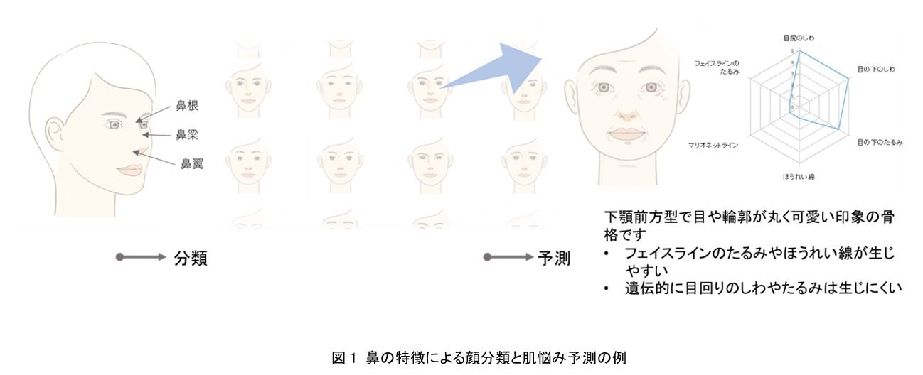 一人ひとりの「今」の肌の状態は、紫外線対策などを含むスキンケアや、食事、運動、睡眠、喫煙などの生活習慣の影響と共に「個々が生まれ持つ肌特性」が関わっていると考えられます。当社はこれまでも今の肌状態について顔画像を用いた評価技術を多数開発し、自宅でのセルフチェックアプリや店頭機器などに応用してきました。さらに個々が生まれ持つ肌特性を知ることができれば、肌悩みに対し事前に対処することができるのではないかと考え、その人本来の特性を高く示している鼻骨格に着目しました。