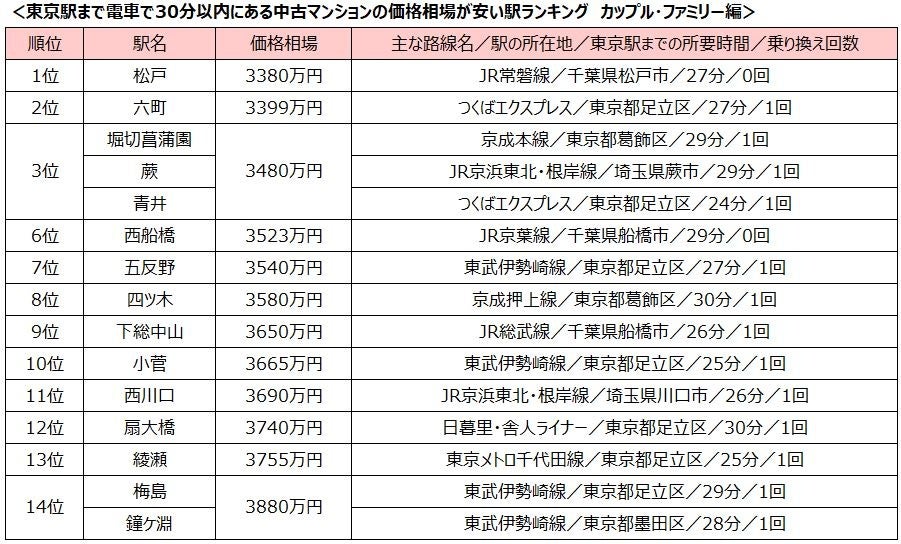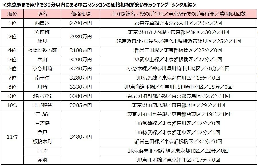 「東京駅」まで30分以内、中古マンション価格相場が安い駅ランキング2024 「シングル向け」1位は西馬込駅!「カップル・ファミリー向け」は東武伊勢崎線から4駅もランクイン