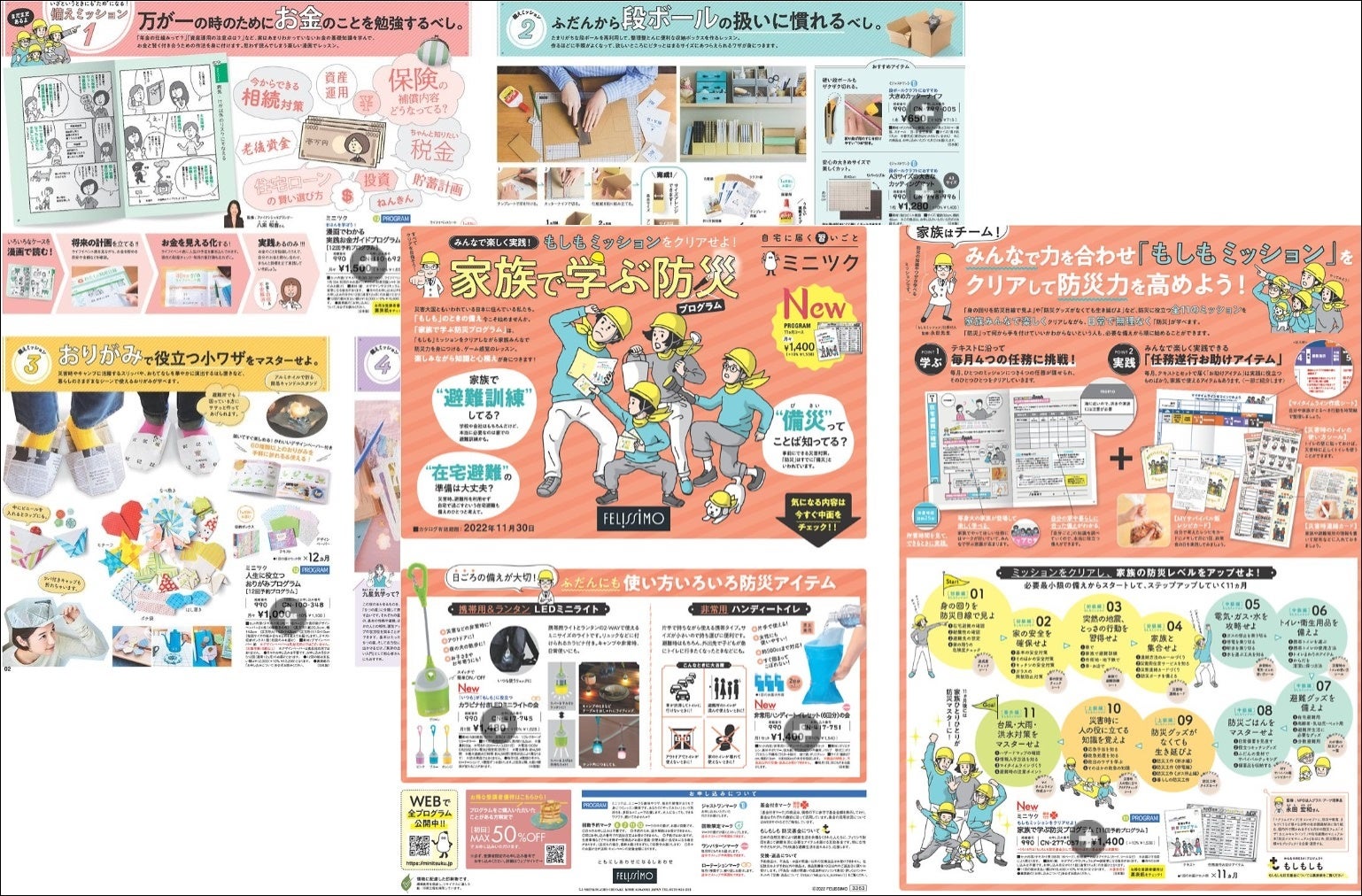 フェリシモが展開する、“おうちレッスン「ミニツク®」”は、レッスンプログラム「もしもミッションをクリアせよ! 家族で学ぶ防災プログラム」を4月26日よりウェブサイトで販売しています。防災に役立つ全11のミッションを家族みんなで楽しくクリアしながら、日常で無理なく「防災」が学べるプログラムです。毎月1つのミッションをこなすようになっており、災害時に起こりうる事態を想定しつつ、家族みんなで楽しく必要な備えができます。災害大国とも言われている日本で「防災」は身近なものですが、意識していても何を準備したらいいのかわからない、「もしも」のときにどう行動すればいいのかわからない、といった不安を回避できるプログラムです。