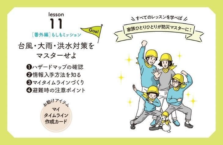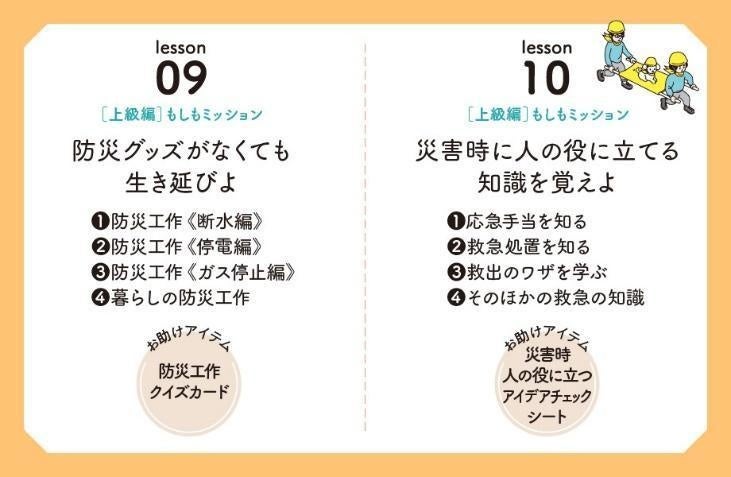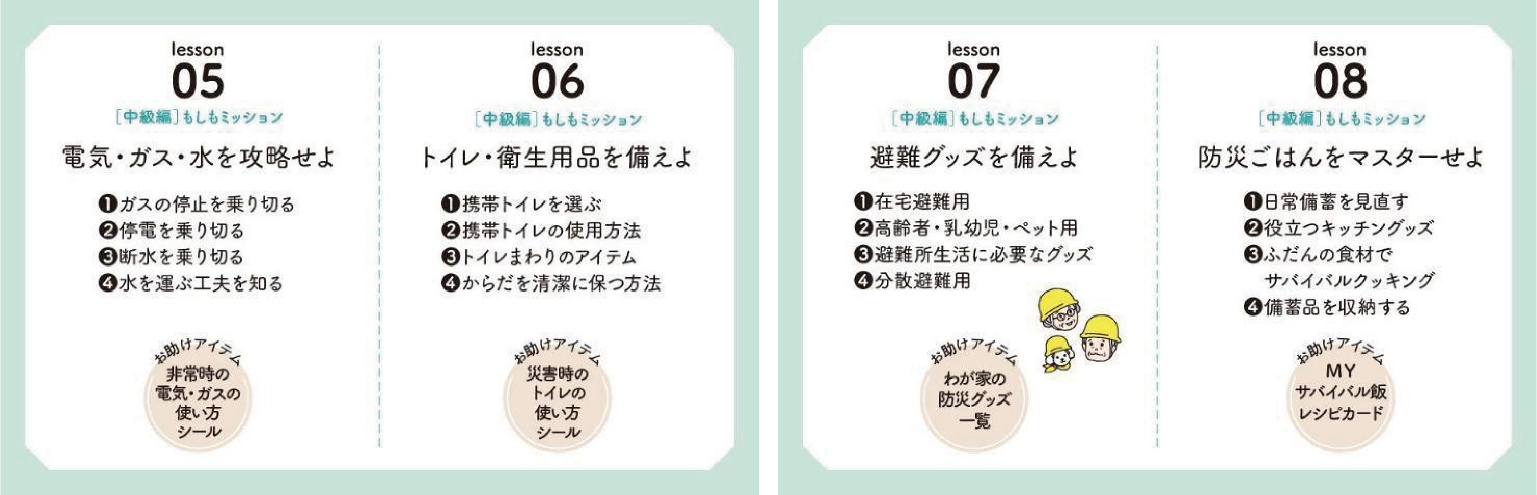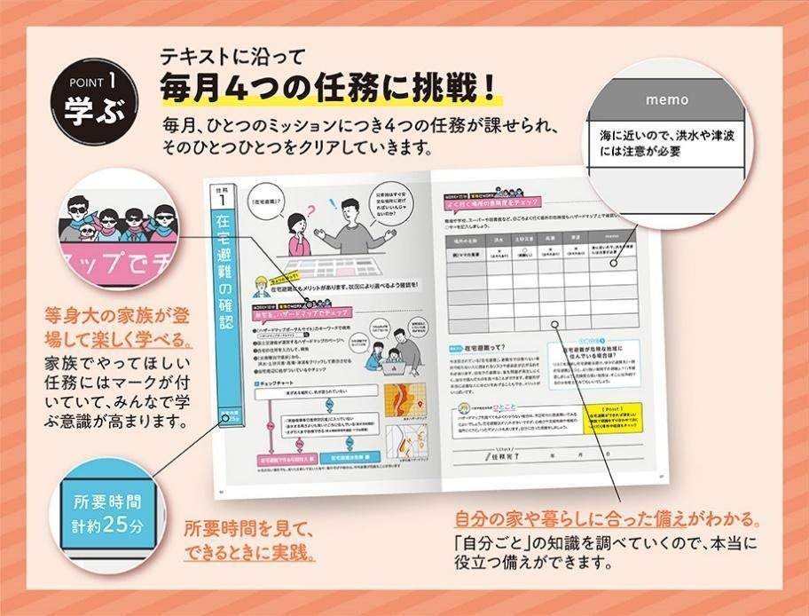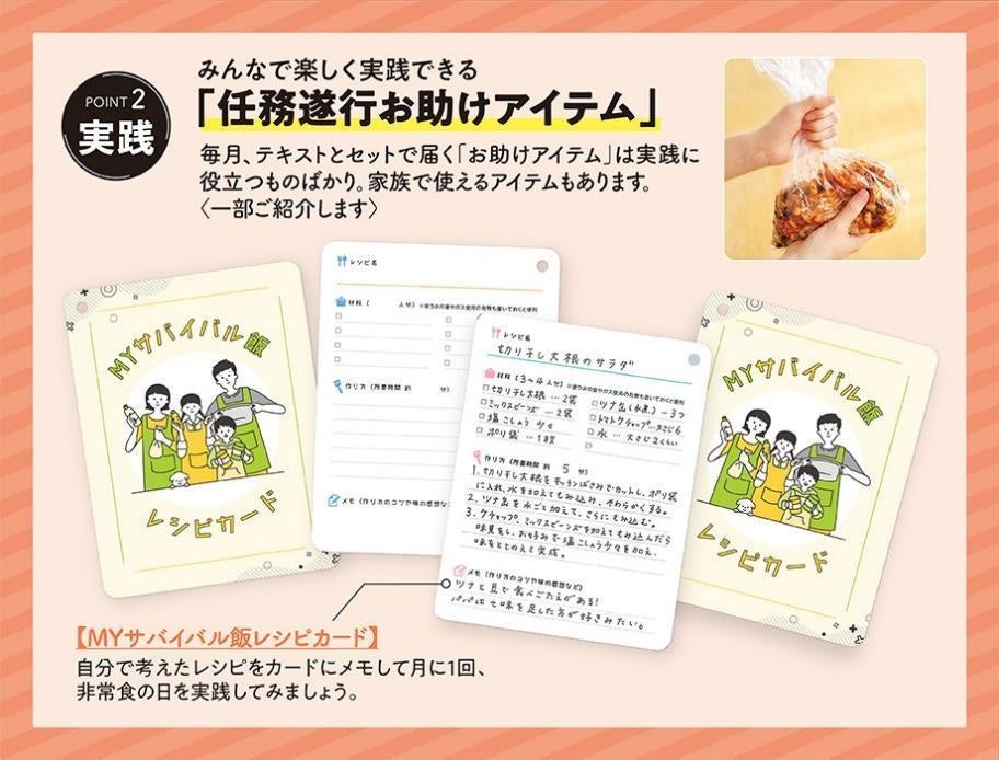 毎月届くテキストと「お助けアイテム」を使って、家族みんなで楽しく防災を学ぶプログラムです。11ヵ月を通して「初級」「中級」「上級」と、防災に対する知識が少しずつレベルアップできる内容で、すべてのミッションをクリアする頃には、家族ひとりひとりが「防災マスター」としてステップアップできます。「身の回りを防災目線で見よ」や「防災グッズがなくても生き延びよ」など、防災に役立つ全11のミッションを通して、「防災」って何から手を付けていいかわからないという人も、必要な備えや防災に対する考え方などを学んでいくことができます。