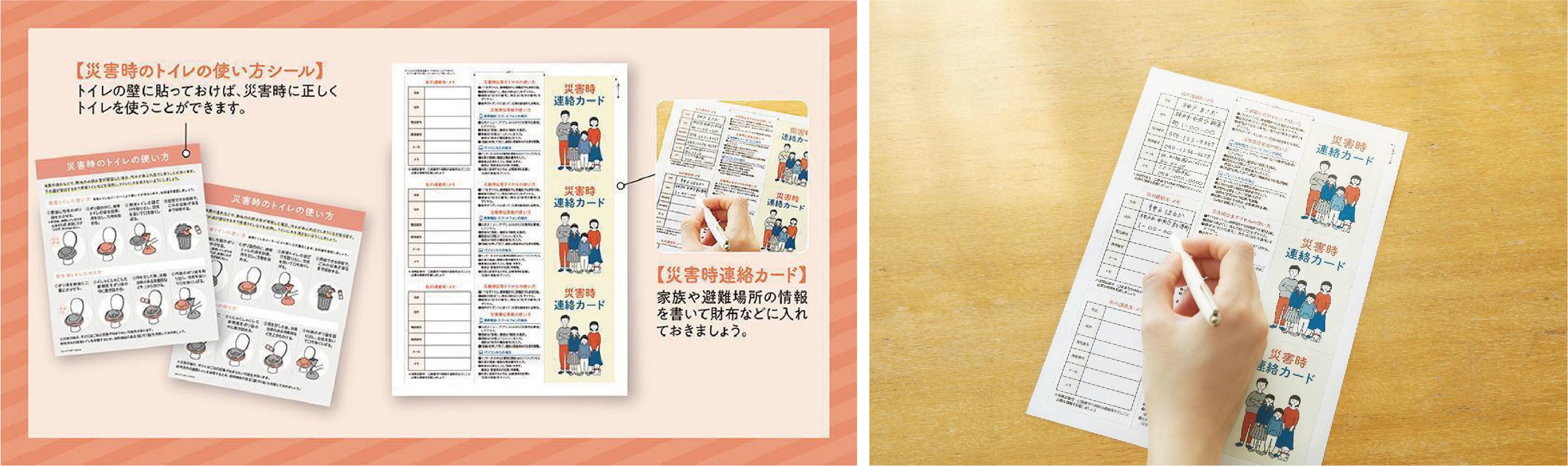 災害時はインフラがストップし、トイレが通常通りに使えなくなる可能性があります。トイレの使い方シールは、壁に貼っておけば、災害時に正しくトイレを使うことができます。災害時連絡カードは、家族や避難場所の情報を書いて財布などに入れておけば、家族が分かれてしまったときに備えることができます。