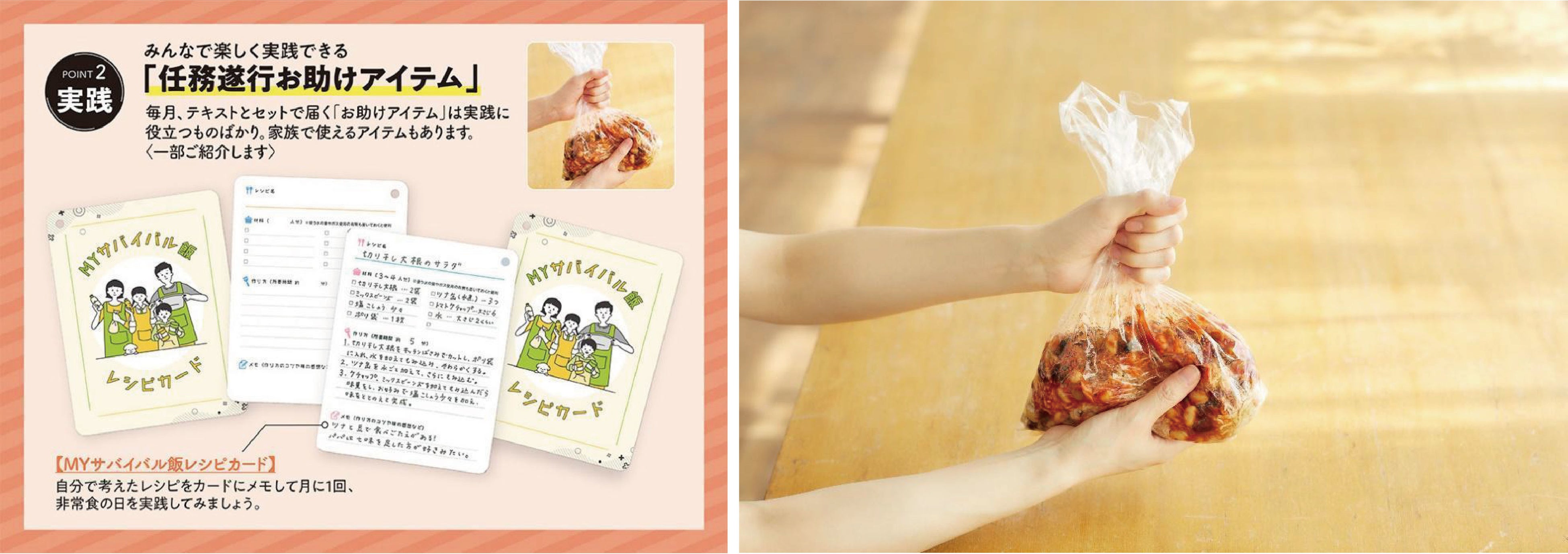 防災の知識が学べるテキスト(B5判 16ページ)と、任務遂行お助けアイテム1セットを毎月届けます。お助けアイテムは、カード、シールなど家族で使えて実践に役立つものです。