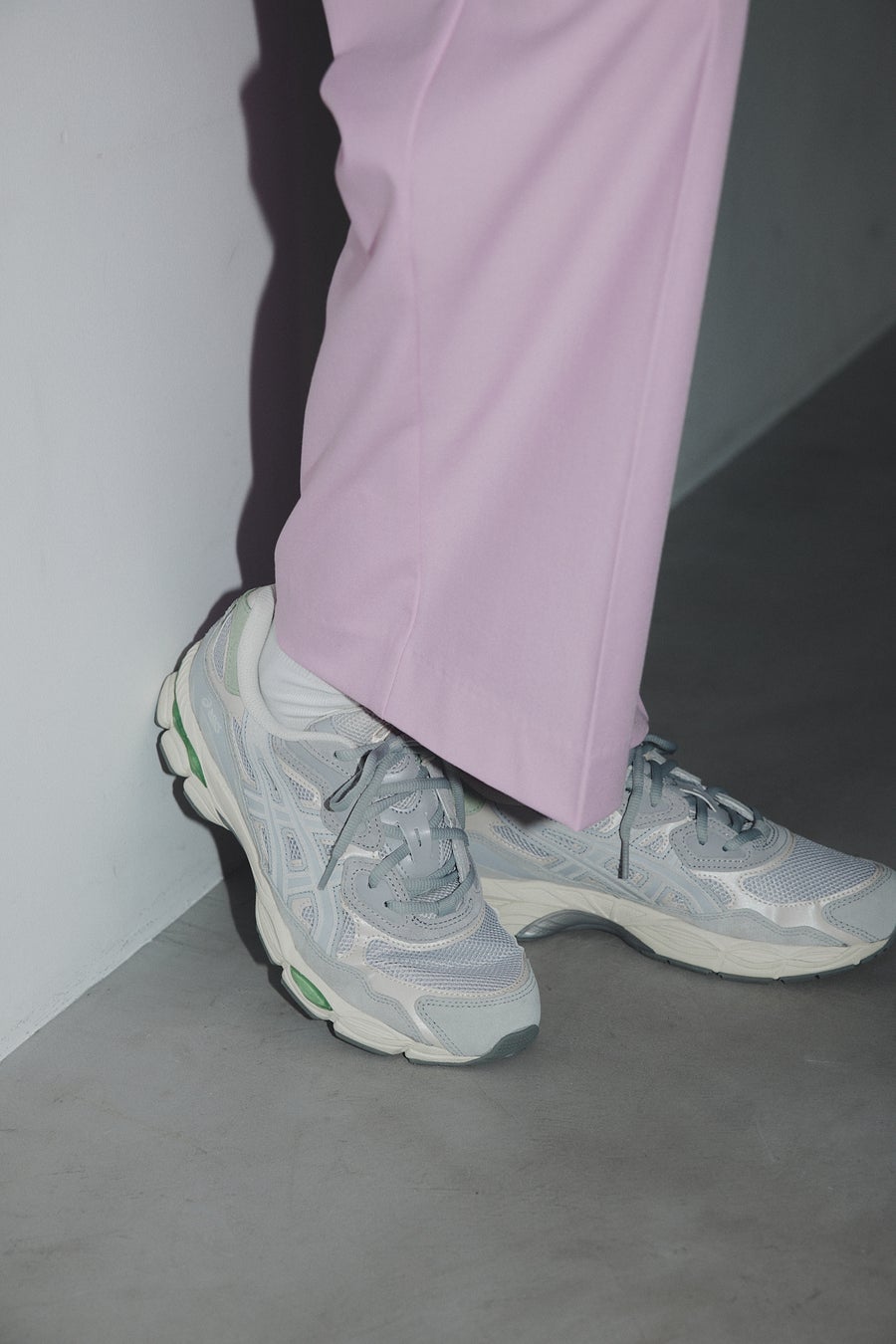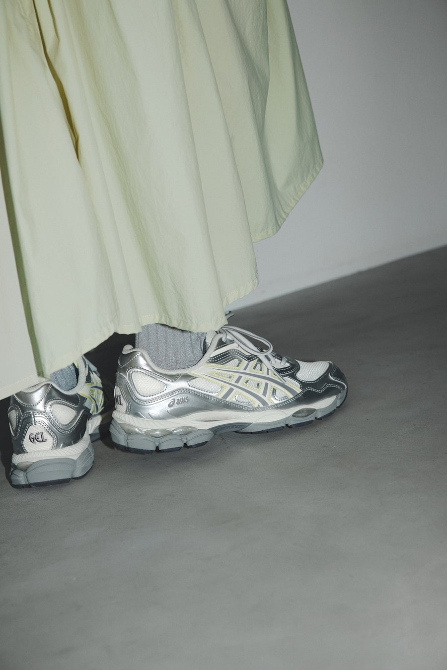 ランニングシューズからインスピレーションを受け誕生した人気のモデルGEL-NYCを、キャッチーなメタリックをメインに、トレンド感溢れるデザインに別注。光沢感とマットな質感の2種類のメタリックを重ね、立体感がありつつ、デイリーに取り入れやすいアイテムに。サイドに走らせたライムイエローはメタリックの質感を引き立てます。ベースのメッシュはアイボリーで柔らかさを感じさせつつ、アウトソールにはパールラメ入りのGELを採用し、華やかな雰囲気をプラス。