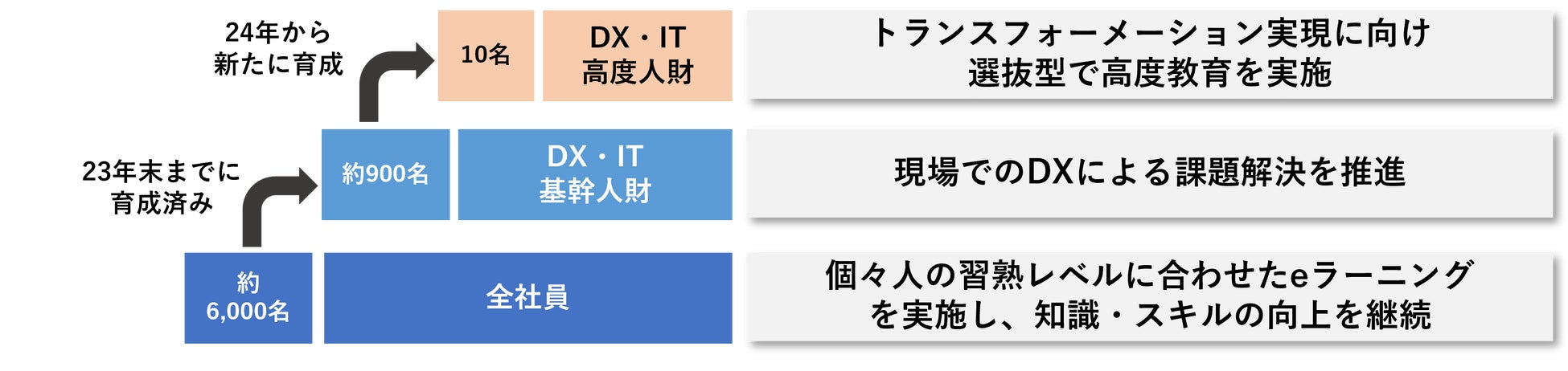 このプログラムは2022年に始動した人財育成プログラムであり、2年間で、全グループ会社社員約6,000名(注1)のDX基礎リテラシー向上と、DX・IT 基幹人財 900 名の育成を完了しました。