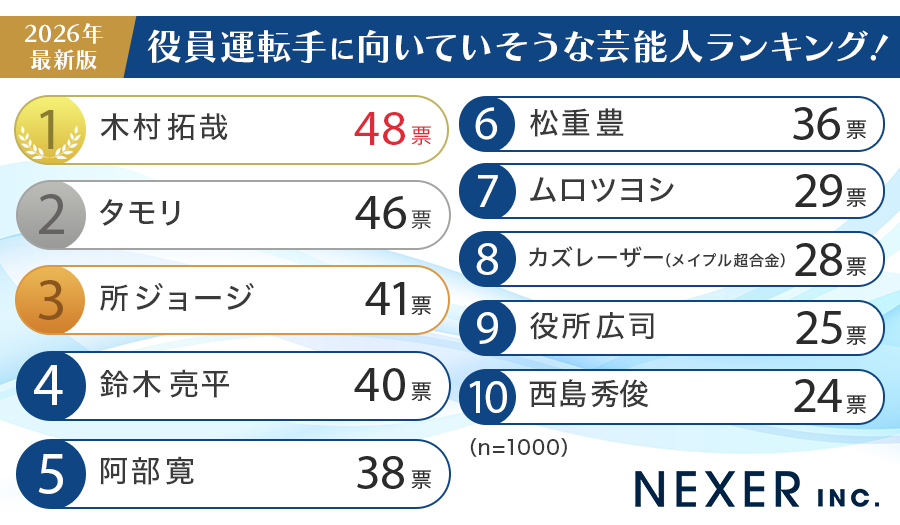 第1位に木村拓哉さん、第2位にタモリさん、第3位に所ジョージさんが並び、上位には「運転がうまそう」「口が堅そう」「信頼できる」という、役員運転手に求められる資質を兼ね備えたイメージの方々がランクインする結果となりました。