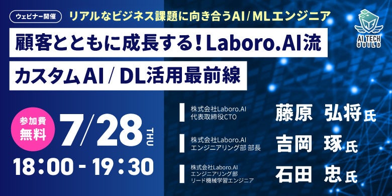 7/28(木)最前線で働くAI/MLエンジニアの生の声をお届け!無料セミナー「顧客とともに成長する!Laboro.AI流 カスタムAI / DL活用最前線」