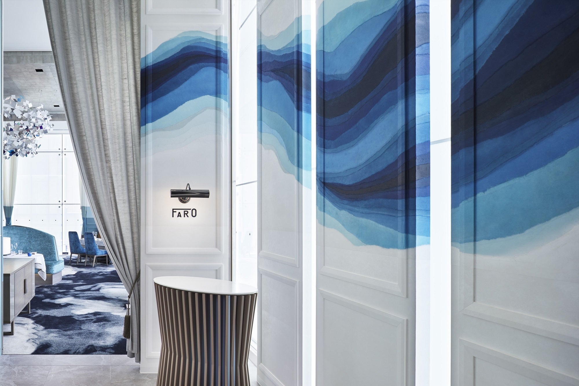 FARO(ファロ)では、”スタッフ全員がフードキュレター”を目指して全国をめぐり、生産者とのつながりを深めています。食器やカトラリー、テーブルアクセサリーにいたるまで、日本のすばらしい伝統文化を守りたいという想いから、新潟の組子、多治見や有田の器、今治の織物、江戸切子のグラスなど、”日本の匠の技”にこだわり、とり揃えています。空間は和と洋の融合をイメージしエレガントでスタイリッシュに演出。大地~海~空という自然を感じる色彩のグラデーションを基調とした店内は昼と夜で、それぞれ趣のある表情を醸し出します。