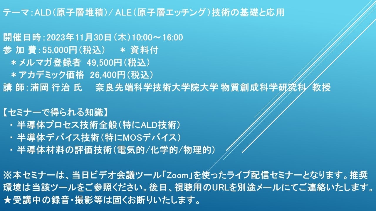 【ライブ配信セミナー】ALD(原子層堆積)/ ALE(原子層エッチング)技術の基礎と応用 11月30日(木)開催 主催:(株)シーエムシー・リサーチ