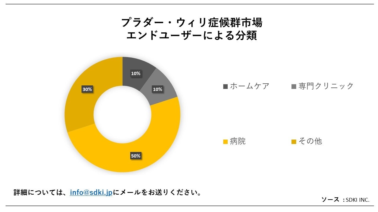 エンドユーザーに基づいて、これらのセグメントの中で、病院はプラダー・ウィリ症候群市場を支配しています。これは、病院が医療機関の提供を優先しているためであり、この稀な症状には特別な注意と治療が必要であり、病院でのみ確実に行うことができます。さらに、特に発展途上国において、新しく先進的な複合専門病院を設立するための政府による投資の増加は、市場の成長に貢献しています。たとえば、インド政府は、緊急対応および医療システム準備パッケージ、アユシュマン・バーラト・プラダン・マントリ・ジャン・アロギャ・ヨジャナ(AB PM-JAY)など、インドの保健医療セクター全体を強化するためのいくつかの計画を立ち上げました。