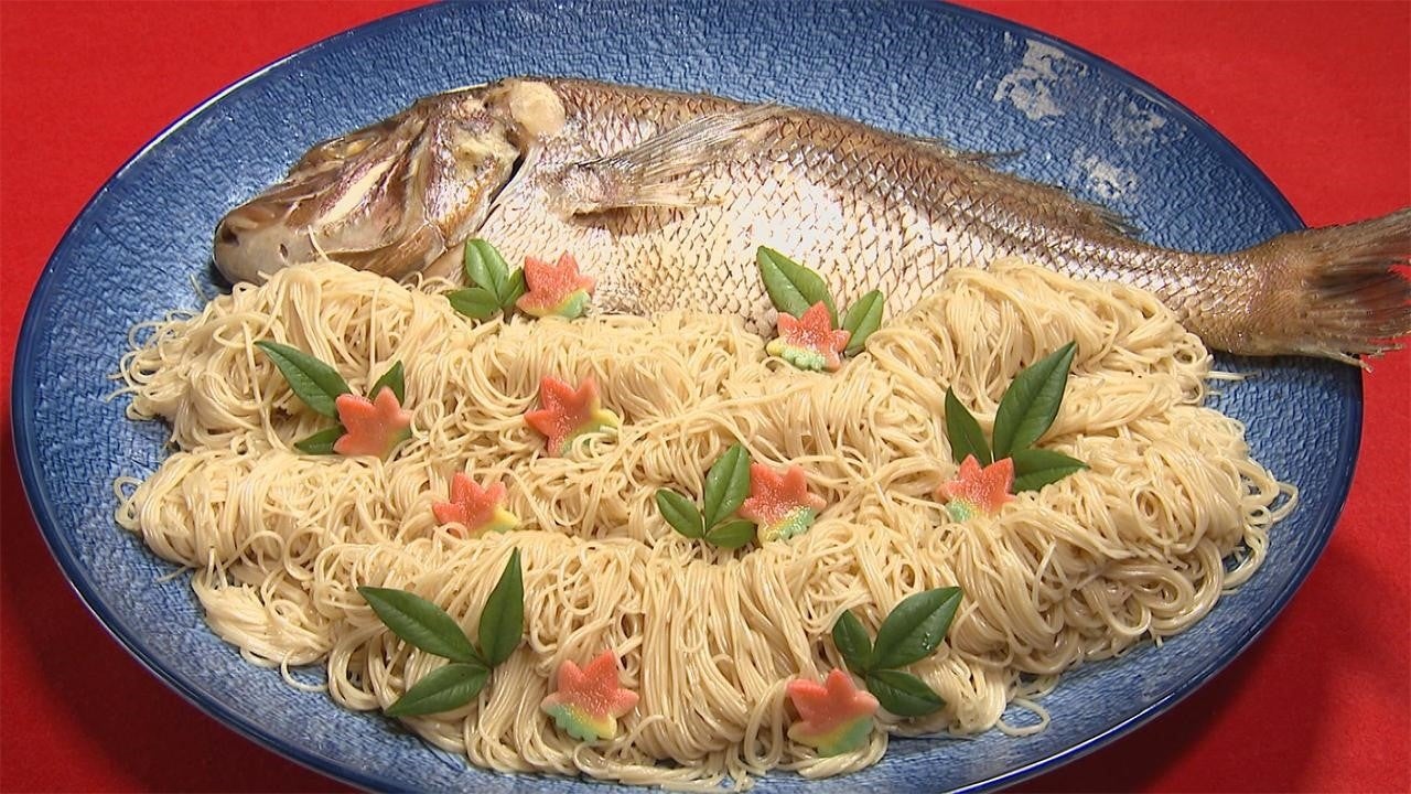 滋賀県には海がありませんが、近江商人のまち日野町の郷土料理には、海の魚“鯛”が使われています。年に一度の「日野祭」の日、県外に商売に出ていた商人が帰郷し、貴重な鯛を使った「鯛そうめん」を客人たちに振る舞いました。江戸中期から末期に広がったと言われる鯛そうめんは、鯛をまるごと甘辛く煮つけ、その煮汁でそうめんを炊いて波の形して大皿に盛り付けたものです。