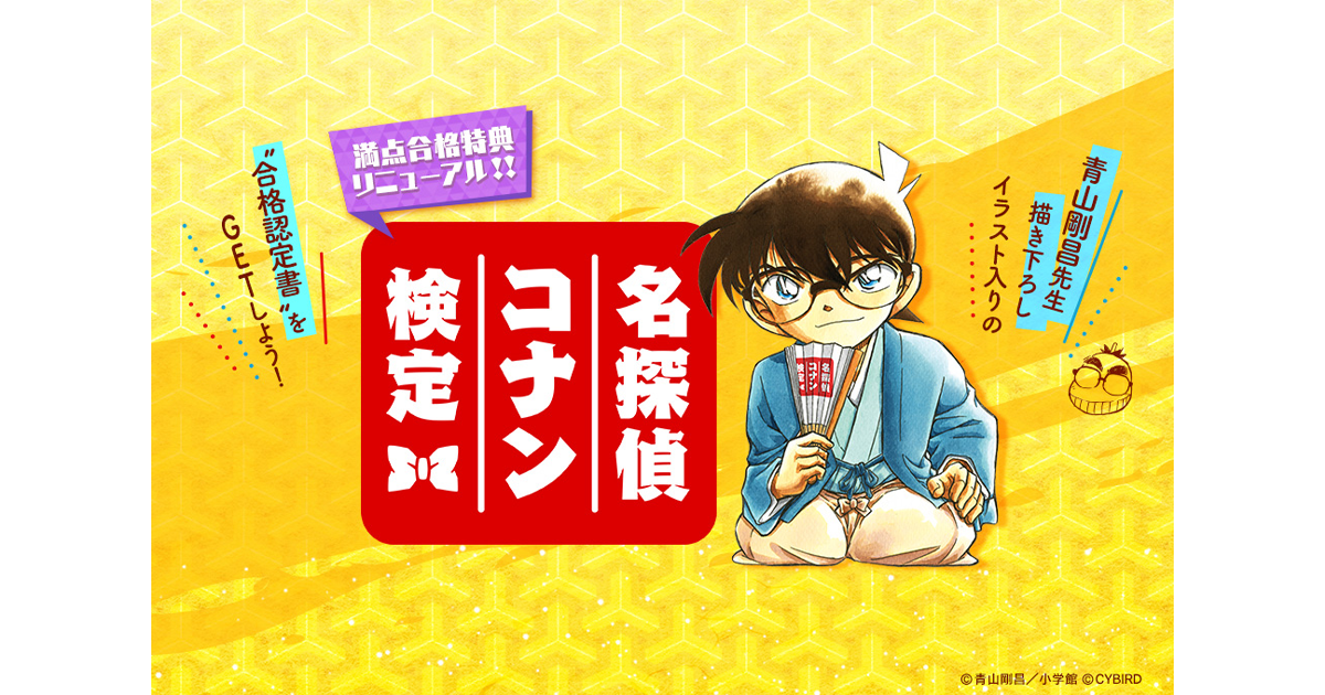 名探偵コナン検定は、株式会社サイバードが主催する、あなたのコナン知識量を測るための検定です。名探偵コナンのコミックスにまつわる問題を階級別(1級~3級)に出題し、正答率に応じて「青山先生描き下ろしイラスト入りの“合格認定書”」を発行します。特典は合格認定書以外にも絵馬型アクリルキーホルダーや限定壁紙など目白押し!満点合格特典もリニューアルしました。詳細は「名探偵コナン検定公式サイト」をご確認ください。