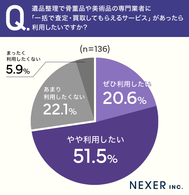 7割以上の方が前向きな回答を寄せたことから、遺品の中にある骨董品・美術品をまとめて査定・買取してもらえるサービスへの潜在的なニーズは高いといえます。
