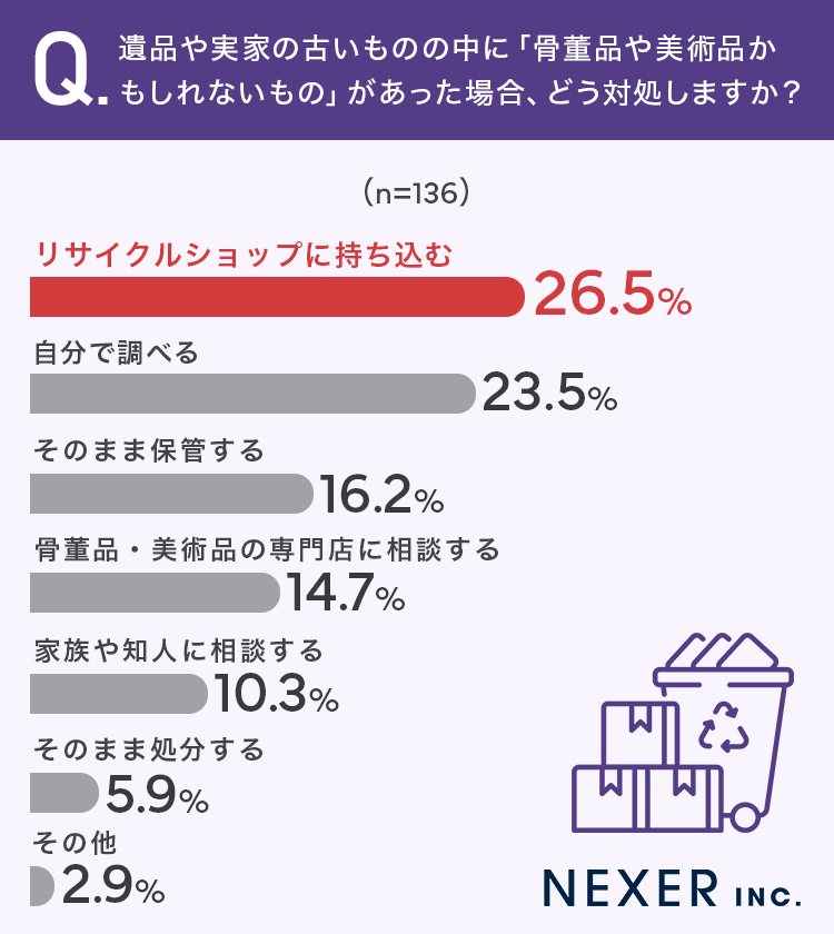 身近な手段で対処しようとする傾向が見て取れますが、裏を返せば、骨董品や美術品の正確な価値を判断できる専門家へのアクセスが十分に知られていない可能性もあるかもしれません。