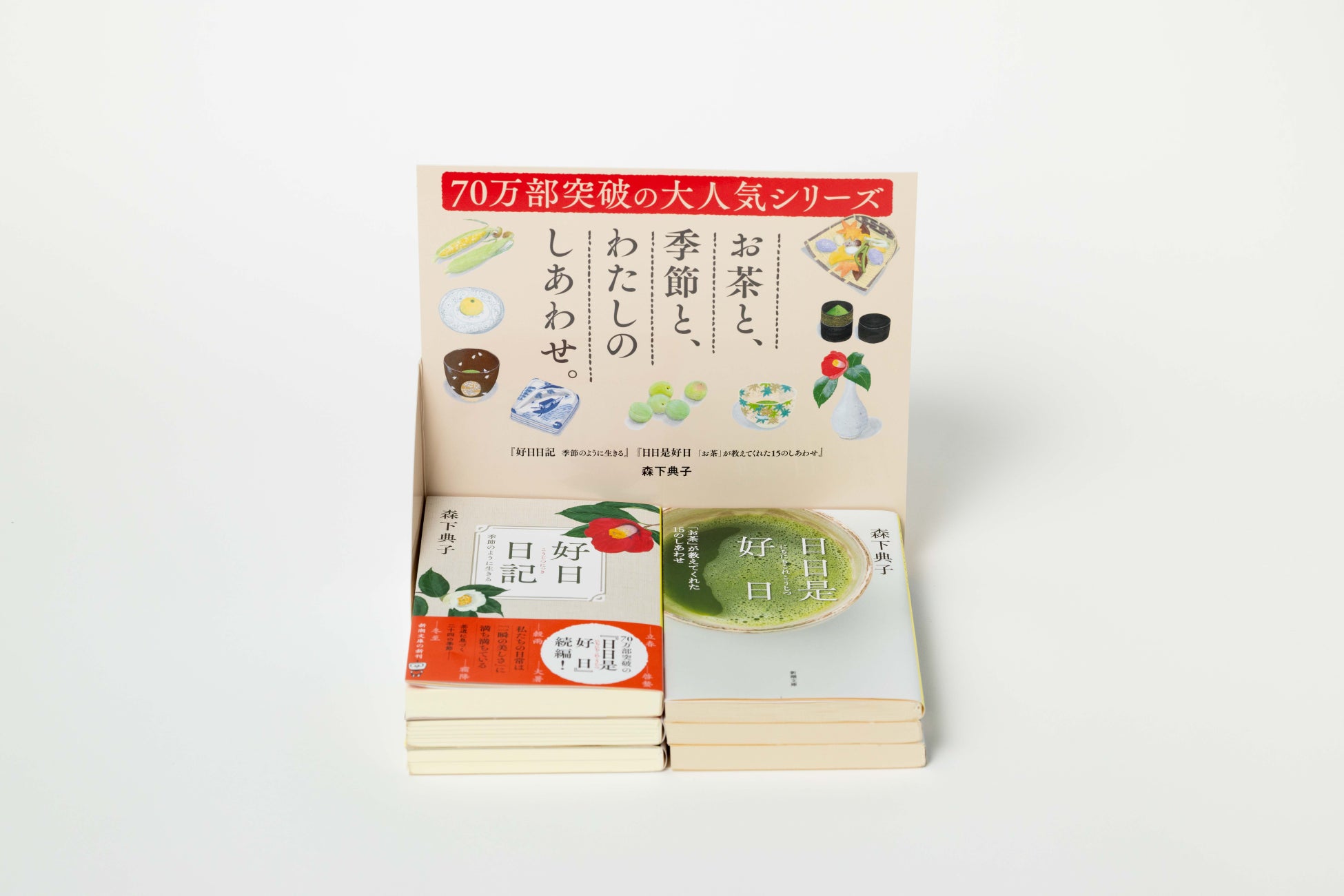 前作の『日日是好日』は2002年に発刊された作品で、日本のみならず、英語、中国語、フランス語など世界13か国の言語に翻訳され、2018年には「第1回日伊ことばの架け橋賞」を受賞しました。今回、続編の『好日日記』の文庫化にあたり、新潮社では『日日是好日』と『好日日記』の2冊が並べられる「2面販売台」を作成。全国各地の書店さんで展開されます。