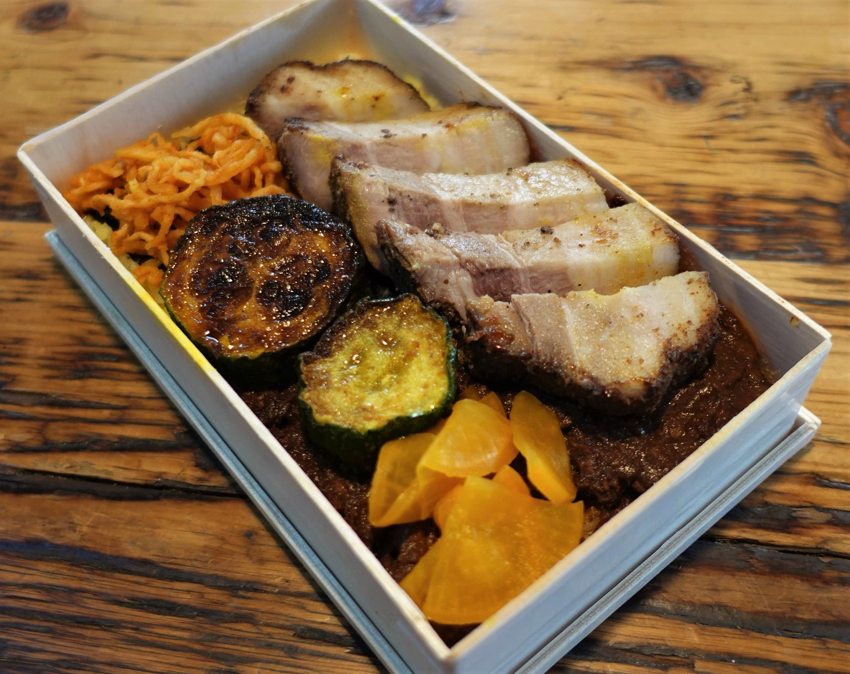 サンラサーのスペシャリテ、氷温熟成氷室豚を贅沢に使用したスパイス弁当。熟成した豚バラ肉の甘みのある脂に合わせたシンプルなスパイス使いのチキンキーマカレーと船橋三番瀬の香り高い海苔を使用し、肉とカレーのどちらも引き立てるバランス感覚はサンラサーの真骨頂です。